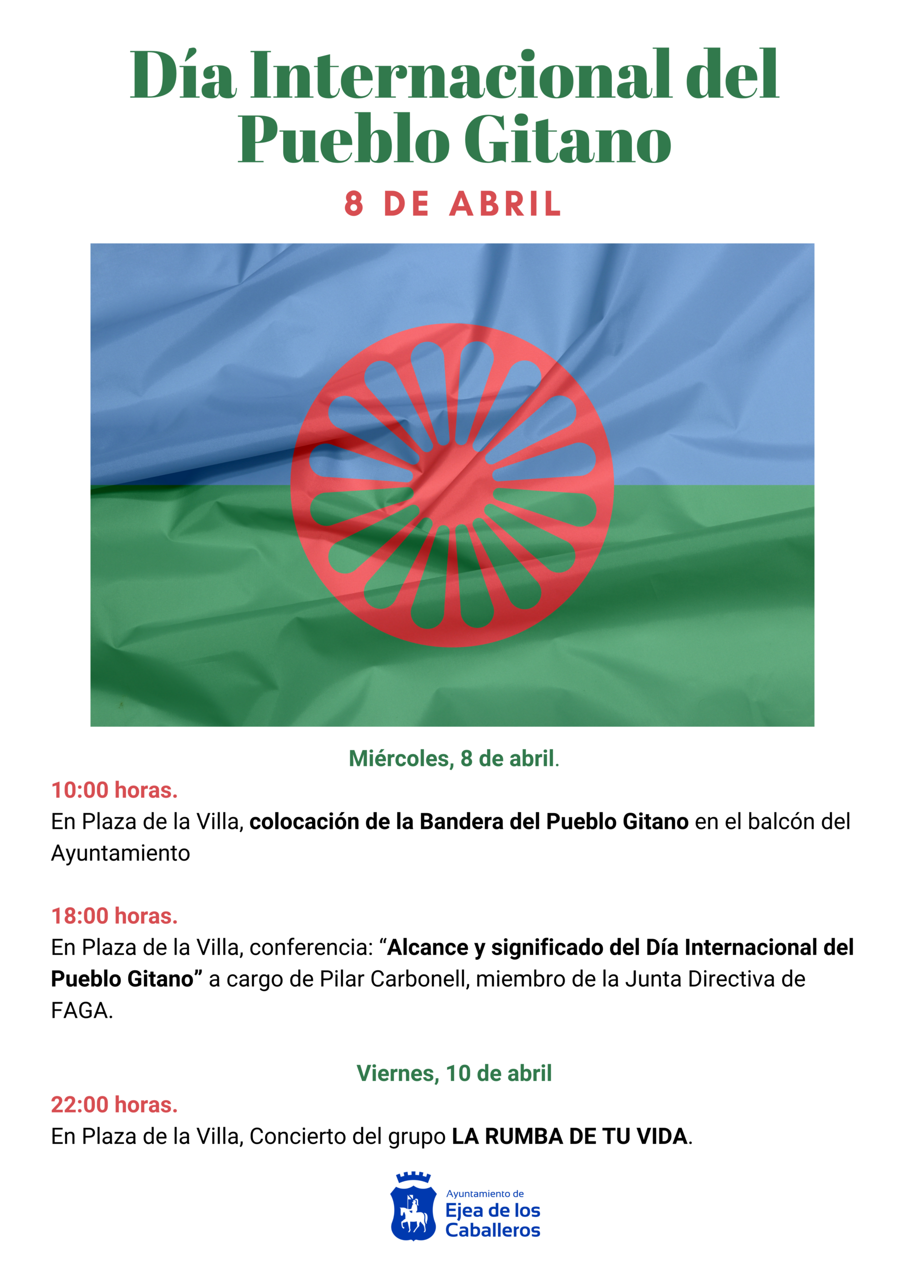 El 8 de abril es el Día Internacional del Pueblo Gitano, una fecha que se estableció hace 55 años en el I Congreso Gitano celebrado en Londres en 1971. En aquel Congreso se instituyó también la bandera gitana que los identifica y el himno internacional gitano “Gelem, Gelem” con el que se recuerda a los gitanos víctimas del Holocausto nazi. A propuesta del colectivo gitano ejeano, el Ayuntamiento de Ejea se une a dicha celebración con un pequeño programa de actos que incluye la colocación de la bandera, una conferencia para acercarnos a la historia y los retos del pueblo gitano y un concierto del grupo “La rumba de tu vida”.