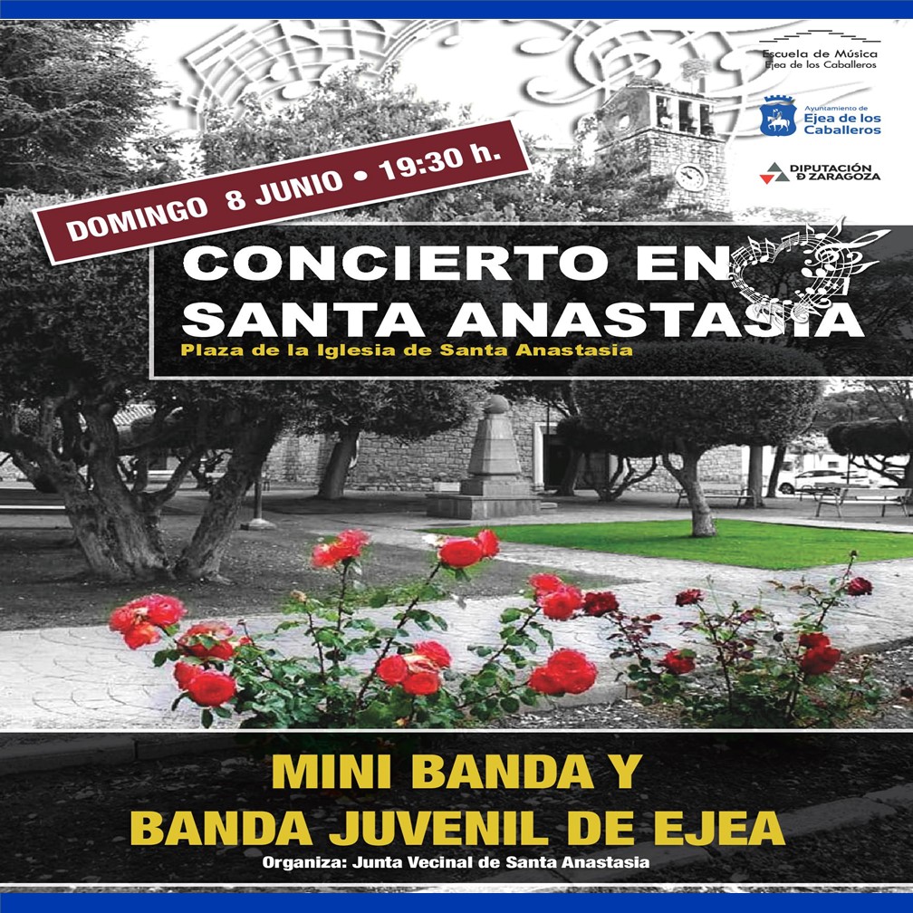 Este próximo domingo 8 de junio, la Banda Juvenil y Mini Banda de la Escuela de Música de Ejea, ofrecerán un concierto en la plaza de la Iglesia de Santa Anastasia, dentro del programa «Bandas en Marcha» de la Diputación Provincial de Zaragoza.