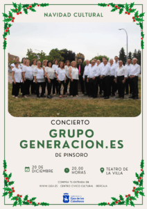 Abriendo el programa cultural de Navidad, el Teatro de la Villa acogerá la actuación del grupo musical de Pinsoro GENERACION.ES. Con un variado repertorio que abarca desde música de los 50 hasta temas actuales, recorrerán géneros y estilos musicales como rumbas, pop, rock, boleros, música tradicional en un concierto que se promete atractivo e intergeneracional como el propio grupo.