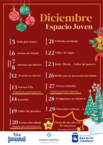 La programación incluirá propuestas como juegos y torneos, sesiones de baile, talleres creativos y gastronómicos, proyecciones de cine, retos divertidos y actividades especiales con temática navideña. Además, algunas actividades ofrecerán regalos y sorpresas para los participantes.