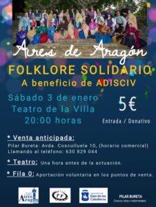 El Grupo Folklórico “Aires de Aragón” realizará nuevamente una actuación benéfica, como ya viene siendo tradición desde hace muchos años, manifestando su compromiso con entidades sociales como ADISCIV, que será la beneficiaria en esta edición de la recaudación de taquilla.