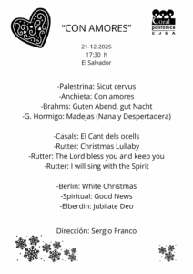 Por otro lado, la Coral Polifónica Ejea interpretará un concierto al que han titulado “Con amores”, en el que partiendo de la polifonía de Palestrina en su 500 aniversario, se interpretarán canciones de cuna clásicas y contemporáneas, finalizando con canciones navideñas de inspiración góspel. Dirigida por Sergio Franco y con el acompañamiento al piano de Amaya Landa, la Coral Polifónica Ejea dedicará su concierto a la Asociación ADISCIV.